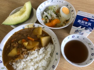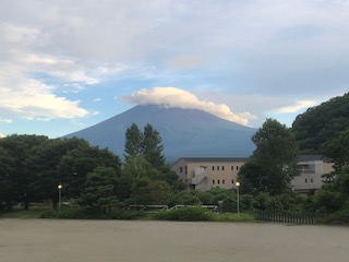 夕食は、カレーライス、薬味、盛り合わせサラダ、メロン、牛乳です。たくさん活動したのでみんなよく食べました。夕食が終わったころ、雲の動きが早くなり、富士山がよく見えるようになってきました。次は、キャンプファイヤーの準備です。