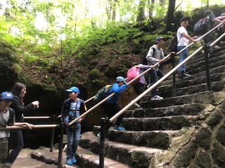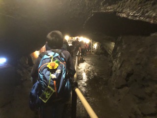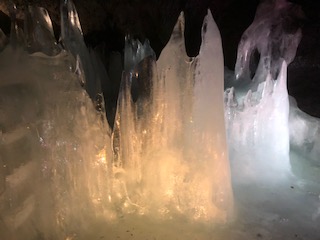 風穴はまさしく天然冷蔵庫でした。氷の柱に歓声が上がりました。出口の階段中ほどから急に暖かくなったことにもびっくりしました。