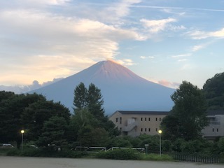 19:00 開始の子ども会のために移動する時、部屋からとても美しい富士山が見えました。夕焼けに染まり輝く姿が大変荘厳でした。ようやく頂上まで見ることができました。大感激です!