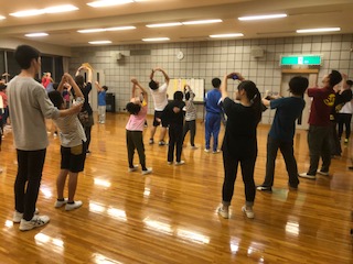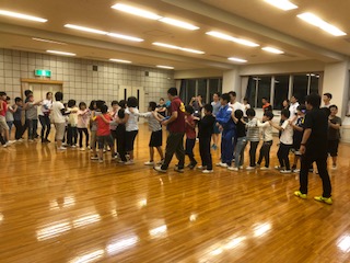 同じブロックの烏山小、祖師谷小、芦花小と一緒に子ども会を行いました。写真は、ジェンカとラーメン体操の様子です。