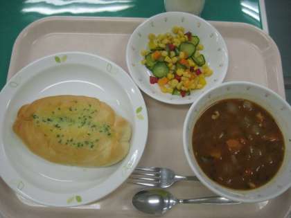 ガーリックフランス 牛乳 ビーンズシチュー トロピカルサラダ