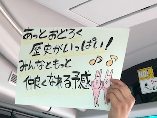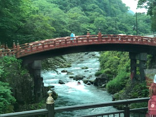 昼食を終えて、バスで日光に向かいます。左の写真はガイドさんが教えてくれた替え歌です。元歌は「恋するフォーチュンクッキー」でラストの部分の歌詞です。右の2枚はバスの車窓から見えた杉並木や神橋の様子です。