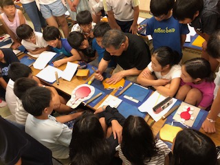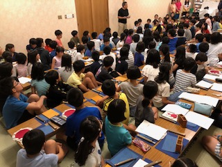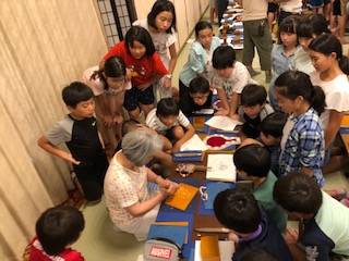 大広間のとなりの会議室で日光彫り体験の開始です。「ひっかき刀」の使い方を教わり、お手本を示してくださる手元に注目して彫り方を学びます。「ひっかき刀」は手前に引き込むように使います。とても集中して真剣に学んでいます。