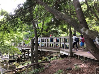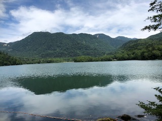 湯ノ湖の眺望が素晴らしいです。活動班ごとでまとまって歩きます。釣りを楽しんでいる人も多いです。