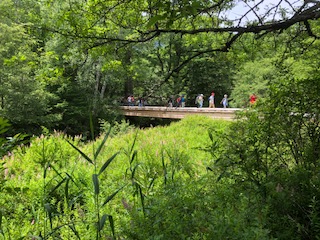 戦場ヶ原の木道を進みます。右の写真は、青木橋です。すれ違う人たちと「こんにちは」と挨拶を交わしています。