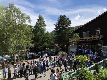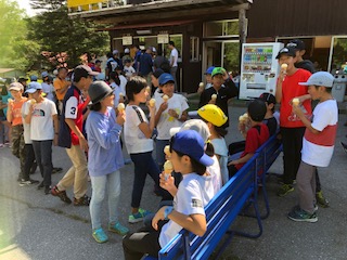 「日光林間学園 NIKKO BOOK 2018」6ページには「がんばって歩いたごほうび」と記されていたアイスクリーム! 引換券を手に行儀よく並んで順番を待ちました。味わった後に感想をインタビューしてみました。大自然の豊かな緑の中で健康に育った牛の恵みの味がして大変おいしかったそうです。