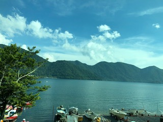 バスの車窓から眺める中禅寺湖です。バスはホテルへ向かいます。帰りのいろは坂は、歩き抜いて疲れた身体を休めるひとときになりました。