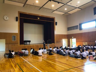 三方湖のほとりにある福井県立三方青年の家に到着しました。体育館でオリエンテーションが始まりました。