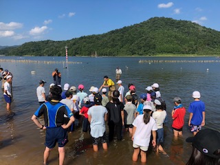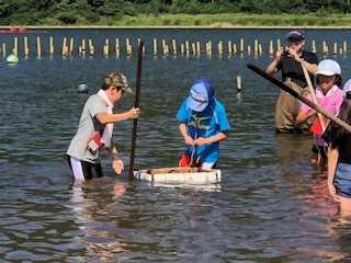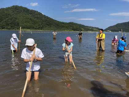 久々子湖でのシジミ採りの様子です。5年位育ったシジミもいました。小さい稚貝はジョレンという道具の間をすり抜けるようになっていました。