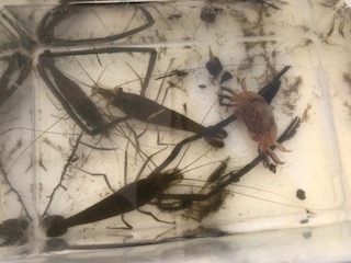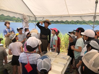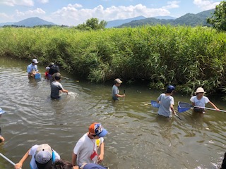 途中で一度休暇を取り、水辺の生き物についてお話を聞きました。2回目のガサガサも、福井県立大学の大学生や大学院生の方々がグループごとに指導してくれました。汽水だからこその生き物もいました。バケツですくったらアシシロハゼの赤ちゃんがたくさんとれました。キタノメダカやカワアナゴも見せてもらいました。雲谷山から流れる川が水の力で様々な生き物を運んでくることを知りました。白く輝く砂は、雲谷山の花崗岩が水の力で運ばれてきたものだそうです。