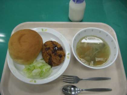 丸パン 牛乳 コロッケ キャベツ ベーコンと野菜のスープ