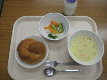 ぶどうパン 牛乳 クリームスープ ピクルス