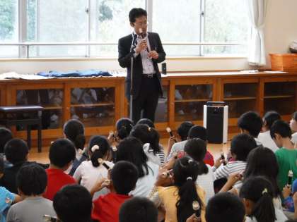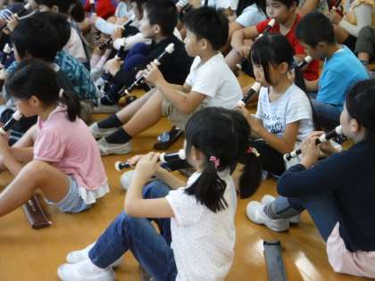 はじめに、みんながよく知っている曲をリコーダーで演奏してくださいました。美しい音色に大歓声が上がりました。講習では、タンギングや指の使い方をおもしろく教えていただきました。これからのリコーダーの学習がとても楽しみです。