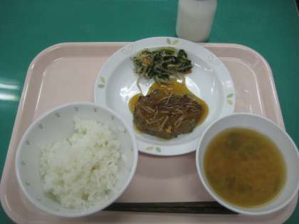 ごはん 牛乳 むろあじバーグ 野菜のごま和え じゃがいもとわかめのみそ汁