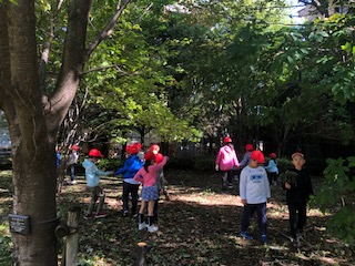 1年生が里山でネイチャーゲームを楽しみました。まさに台風一過! 実をたくさんつけたままの枝が落ちていました。思い思いに行動できると気付きも広がります。子どもたちの思いや願いに合わせた探検を今後も計画していきます。里山コア会議の皆様、ご支援ありがとうございます!