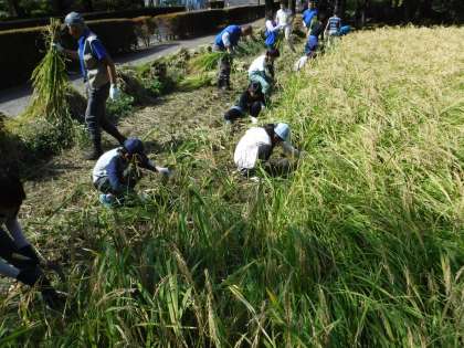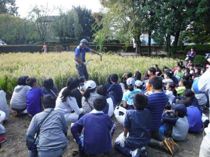 秋晴れの空の下、次大夫堀公園で稲刈りを体験してきました。豊作に恵まれ、収穫の秋を楽しみました。
