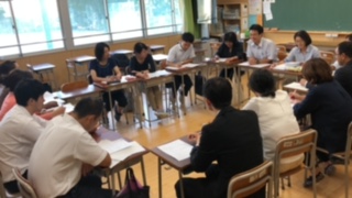 「砧の学び舎」である砧中学校、砧小学校、明正小学校、山野小学校の4校の教員が砧中学校に集まって、合同研修会を行いました。砧中学校の全クラスの授業を参観した後、健康・体力・心の教育、特別支援教育、美術・図工・技術、音楽、家庭科、国語、社会、算数・数学、理科、英語の各部会に分かれて意見交換をしました。教科による授業研究を通して異校種の学習内容を理解し、わかりやすい授業づくりを目指すことをねらいとして実施しました。