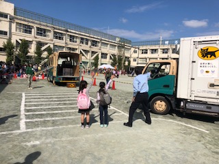 ヤマトコーナーでは、交通安全教室が行われています。実際にトラックに乗り、運転席から見えにくい場所を確認することもできます。(協力 ヤマト運輸株式会社)