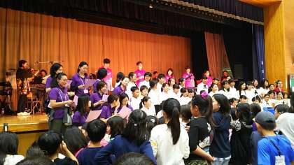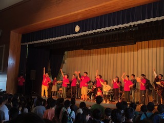「やってみよう」には29名の先生が次々と登場し会場が大歓声で盛り上がりました。「ふるさと」では明正小合唱団と明正小PTAコーラス部、PTA役員も加わり、本格バンドMMCBの演奏に乗って会場も含め大合唱となりました。