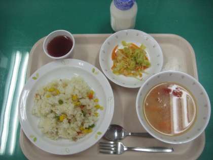 コーンピラフ 牛乳 イタリアンサラダ タラのトマトスープ ぶどうゼリー