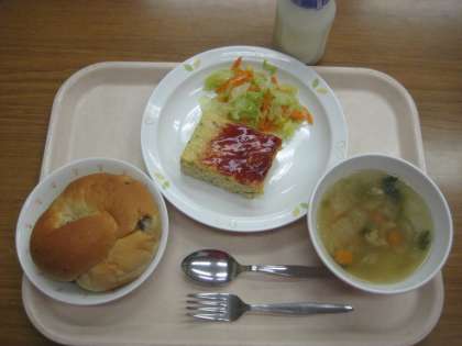 ぶどうパン 牛乳 オムレツ コーンサラダ コンソメスープ
