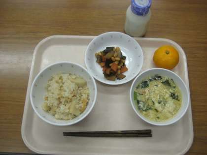 里芋ごはん 牛乳 五目豆 かきたまじる みかん