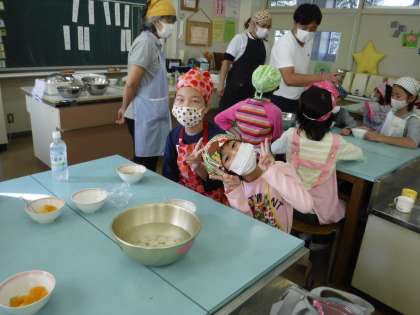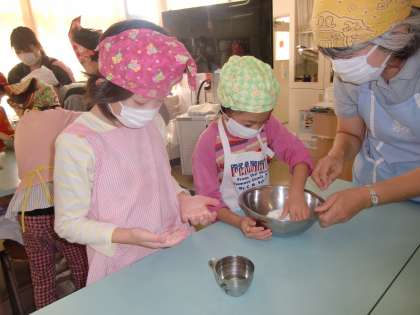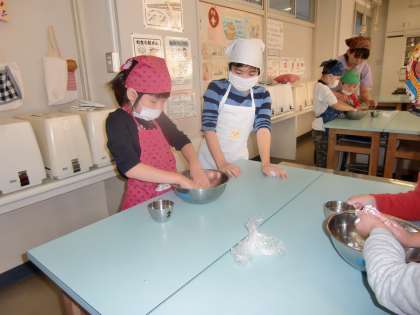 調理実習で白玉団子を作り、フルーツ白玉にして食べました。白玉粉をこねる作業は班のみんなで役割を分担し、協力して行いました。