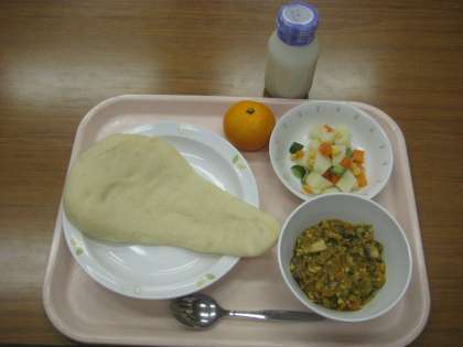 ナン 牛乳 キーマカレー マセドアンサラダ みかん