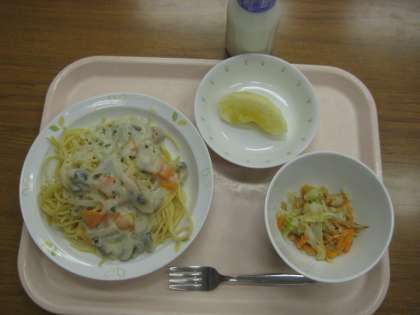 スパゲッティクリームソース 牛乳 ごぼうチップサラダ りんご