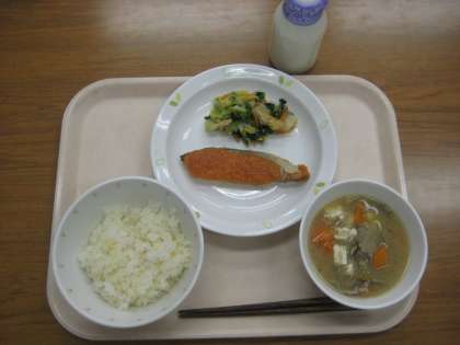 きびごはん 牛乳 鮭のもみじ焼き おひたし さつまじる