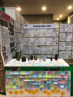 14:30バス出発を目指して子どもたちは集合場所に向かいました。どこでどんな出会いや学びがあり、どんな刺激をもらい、どんな発見や新たな興味・関心につながったのか、ぜひぜひ子どもたちから直接聞いてみたいです。きっと私たちの予測を超えた体験と学びが得られたと確信しています。振り返ると今回明正小ブース以外での子どもたちの見学や活動の様子についてはあまりご紹介出来なかったことに気付きました。ここでの子どもたちの発信の様子があまりにもひたむきで頼もしくて一瞬たりとも見逃せない、訪問者との対話を一言たりとも聞き逃せない、そんな思いでいっぱいだったものですから、ついつい他の場所に足を運ぶことが出来ませんでした。エコプロ全体の様子についてはサイトを検索してご覧いただければ幸いです。魅力的なブース、ESDやSDGsに関連したブースがたくさんあります。ご都合がよろしければぜひ土曜の午後にご家族でご来場ください。子どもたちが帰った後、明正小の卒業生、成城三丁目緑地の近くの林野庁官舎にお住まいだった方、世田谷区内の他校の保護者の方、明正小に電力を供給している会社の方、学習交流を希望する他県の学校関係者の方々がおいでになりました。授業協力のお申し出も何組もありました。6年生が6年間の里山活動を振り返って書いた作文を全部読んで感激してくれた方もいました。皆さん、たくさん感想をお寄せくださいました。500部準備してきた活動紹介のリーフレット(チラシ)はあとわずかになったので追加で準備いたします。