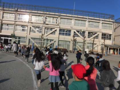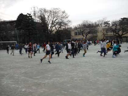 1月の体育朝会は持久走に取り組みました。低学年は4分間、高学年は5分間、自分のペースで走りました。
