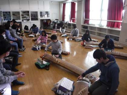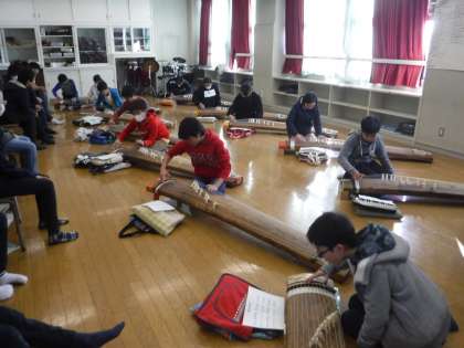6年生は音楽の授業で「箏」に挑戦しました。授業の最後には「越天楽今様」を演奏し、クラスみんなで箏の音色を味わいました。