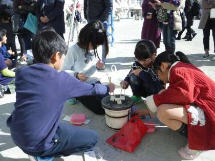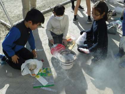 社会科の「むかしのくらし」で七輪体験をしました。火をつけることに苦戦。火がつくとあたたかく、おもちを焼いて食べました。