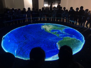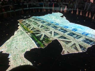 “Touch the World”ジオラマのプロジェクション・マッピングの様子です。右の写真は明正小です。子供たちから歓声があがりました。