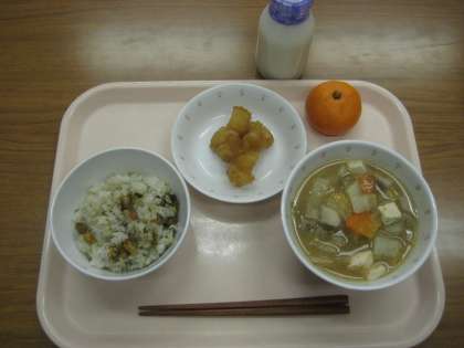 豆ごはん 牛乳 いわしのつみれ汁 じゃがいもの甘辛煮