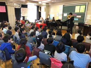 3年生が本校教員のトロンボーンの生演奏を鑑賞しました。金管楽器の仕組みもよくわかりました。これまでの授業で学んできたことのよいまとめになりました。楽器演奏への親しみや憧れにつながることを期待したいです。