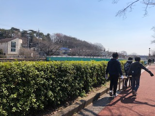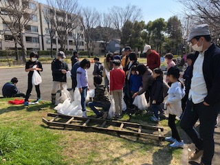 パイプ椅子や脚立をはじめ予想しなかった物も回収できました。運ぶのが大変でした。世田谷トラストまちづくりビジターセンター脇に集合し皆さんと一緒に休憩タイムです。子どもたちが活動に加わったことを皆さんに喜んでいただきました。子どもたちにもよい経験になりました。お世話になりました。野川沿いの桜は月末には見頃となるそうです。楽しみですね。