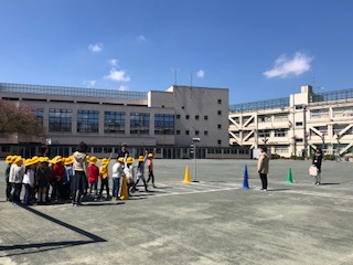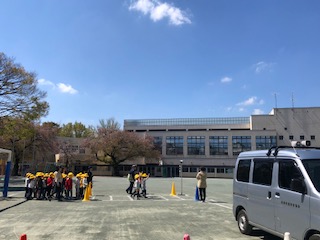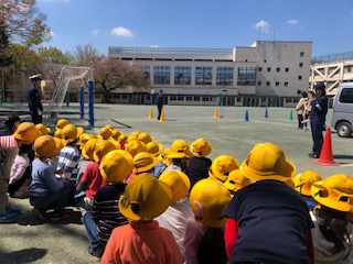成城警察の協力を得て校庭で歩行訓練を行いました。おまわりさんのお話をみんな真剣に聞いて訓練をしました。