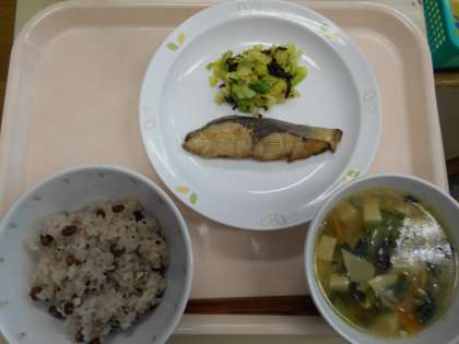 赤飯 牛乳 ぶりのてりやき キャベツの塩こんぶかけ 吉野汁