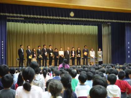明正小を離任した教職員の離任式を行いました。代表の児童がお礼の手紙を読み上げました。最後に全員で校歌を歌いました。