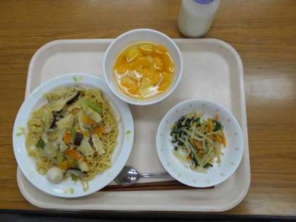 五目あんかけやきそば 牛乳 塩ナムル フルーツ白玉