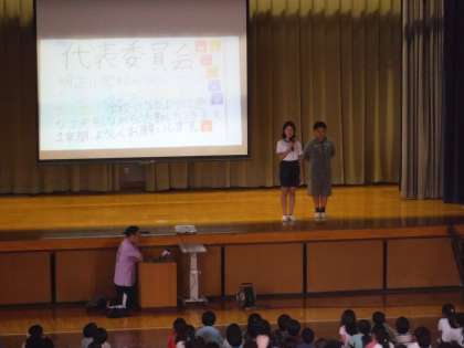 今日の児童集会は委員会紹介でした。各委員会の委員長と副委員長がステージに立ち、活動計画のPRポスターを大きく映像で示して、本年度どのような活動をしていくのか発表しました。委員会を通して、よりよい明正小を創っていってくれることを期待しています!