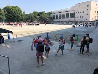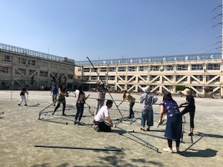 成城自治会からお借りした簡易テントが放送機器の保護と放送担当教員の日よけに大変重宝しています。成城まちづくりセンター、喜多見まちづくりセンター、砧中学校から借用したテントの骨組みを低学年児童席などに設置したほか、昇降口全3カ所へのミストシャワー設置など、運動会の環境づくりの準備が進んでいます。テント設置には新旧PTA役員及びサラマンドラの保護者有志の皆様にご協力をいただきました。ありがとうございます。明日は9:00から児童席テントへの遮光ネット取付を行います。お手伝いいただける方は軍手持参でご来校いただければ幸いです。ミストシャワーは昨年度設置したものよりしっかりした仕組みの物に変えることが出来ました。子どもたちが喜んでくれているので設置し甲斐がありました。