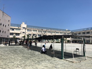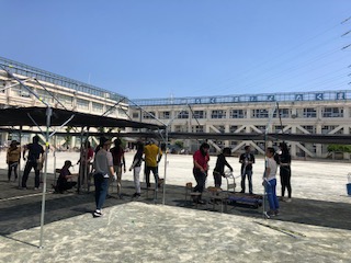 昨日設置したテントの骨組みに、今日は遮光ネットを取り付けました。たくさんの方々のお手伝いをいただき日陰の確保が出来ました。ご協力に感謝申し上げます。