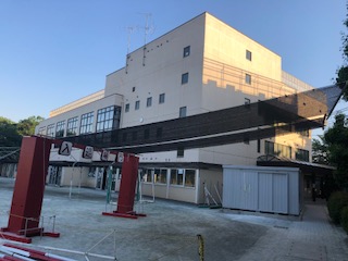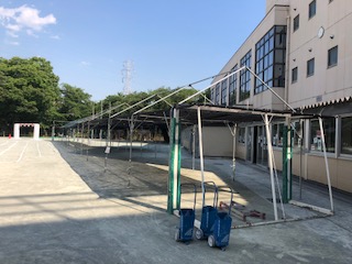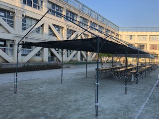 昨年度製作した入退場門に加えて、今回は児童席や敬老席、来賓席等に遮光ネットのテントが設営できました。東校舎3階も今年新たに観覧席として開放します。エアコン稼動のため窓の開閉はできませんがご利用ください。体育館は昼以外の時間も開放することに変更しましたのでご利用ください。ミストシャワーは昇降口3カ所で稼働します。なお体育館2階は4年児童の観覧席として利用いたします。
