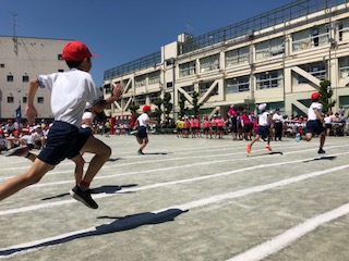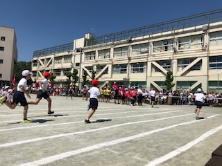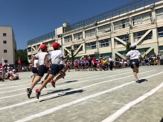 5年生は今年から100mを走ります。スピードを落とさずにコーナーを走る姿や最後まで全力で走り切る姿に大きな声援が送られました。