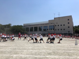 校庭の中央に思いっきりダッシュして自分の陣地まで竹の棒を引っ張っていきます。どちらがたくさんゲットできるか赤組白組どちらも一致団結してがんばります。