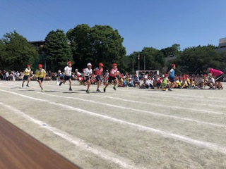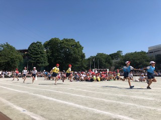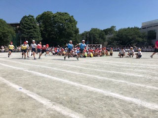 運動会最後の競技、高学年リレーが始まりました。選手は各クラスの代表としての自覚をもって一生懸命練習に取り組んできました。見どころはバトンゾーンです。スピードを落とさず前を向いたままバトンパスが出来るよう何度も練習を重ね調整をしてきました。高学年の力強いリレーに会場中「ゴーゴーゴー!」の歌の大合唱と応援が響き渡りました。