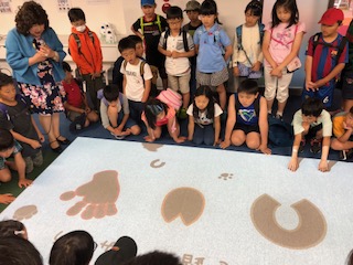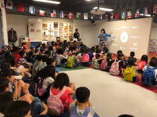 お礼や感想を発表した後、エントランスエリアの説明をしていただきました。日本語であいさつするとその言葉に反応していろいろな国の言葉が出てきたり、フロアに投影された動物の足跡を踏むとその動物の姿や英語での呼び方が聴こえたりします。英会話ロボットとの会話を楽しめるコーナーもあります。ぜひ今後ご家族でご利用ください。平日は13:00-17:00、土日や長期休業期間は10:00-17:00(中央図書館閉館日以外)、無料で利用できます。ALTが交代で何人も常駐しています。今日は明正小に来てくれたことのあるALTが担当でしたので子供たちはとても身近に感じたようでした。詳しくは世田谷区立教育センターTouch the World のホームページでご確認願います。
